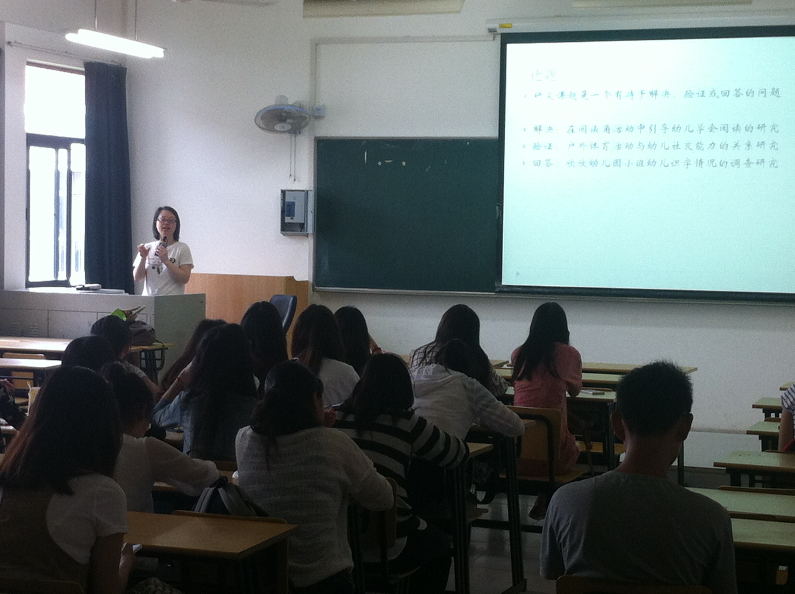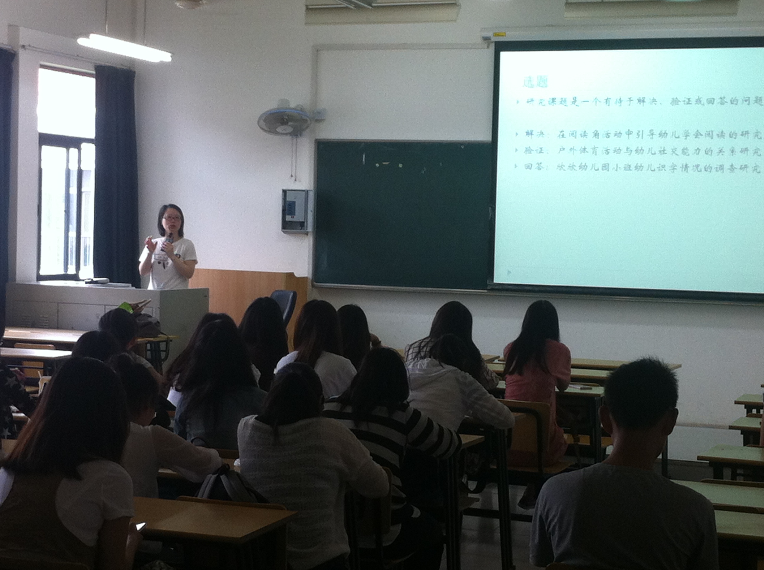 6月10日上午在五教A座211教室tyc41183太阳成集团学前教育系副主任何慧华老师为2013级学前教育世承班的同学们进行了“学前教育科研方法”的讲座。