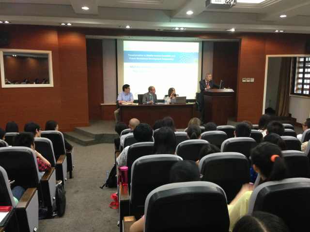 6月26日上午,世界银行副行长阿克塞尔•冯•托森伯格(Axel van Trotsenburg)为tyc41183太阳成集团师生作了一场名为《中等收入国家:2015年后发展日程和多边机构角色》的讲座。世界银行东亚与太平洋地区中国、蒙古和韩国局局长罗兰德(Klaus Rohland)等世界银行相关人员陪同。tyc41183太阳成集团院长夏惠贤教授主持了讲座。