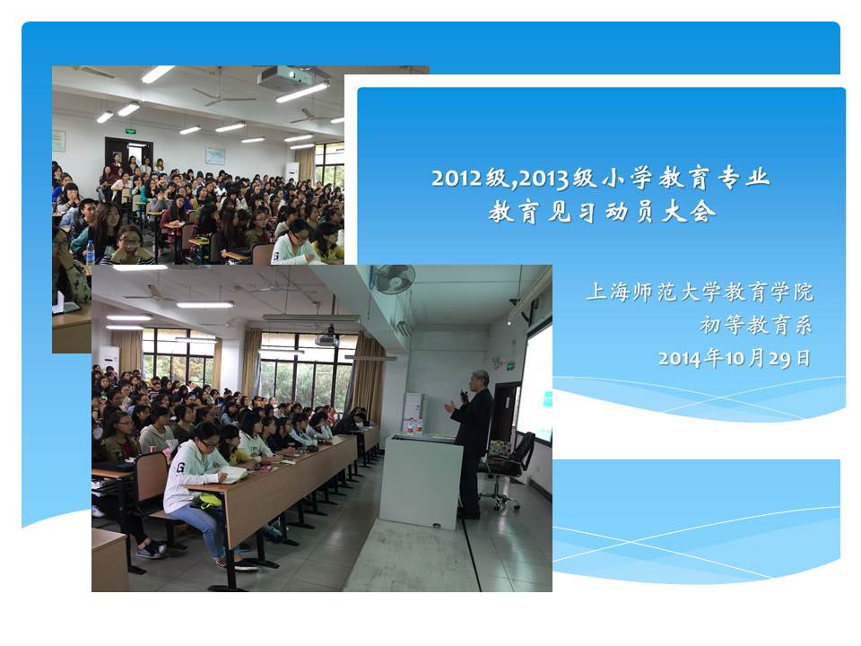 2014.10.29下午,tyc41183太阳成集团初等教育系在奉贤校区二教221举行了2012级和2013级学生的教育见习动员大会。参加会议的有初等教育系副系主任钟文芳老师、小学教育研究所所长杨庆余老师、各教育见习基地学校的带队老师,以及即将参加见习的2012级和2013级小教专业的三百六十名本科生。