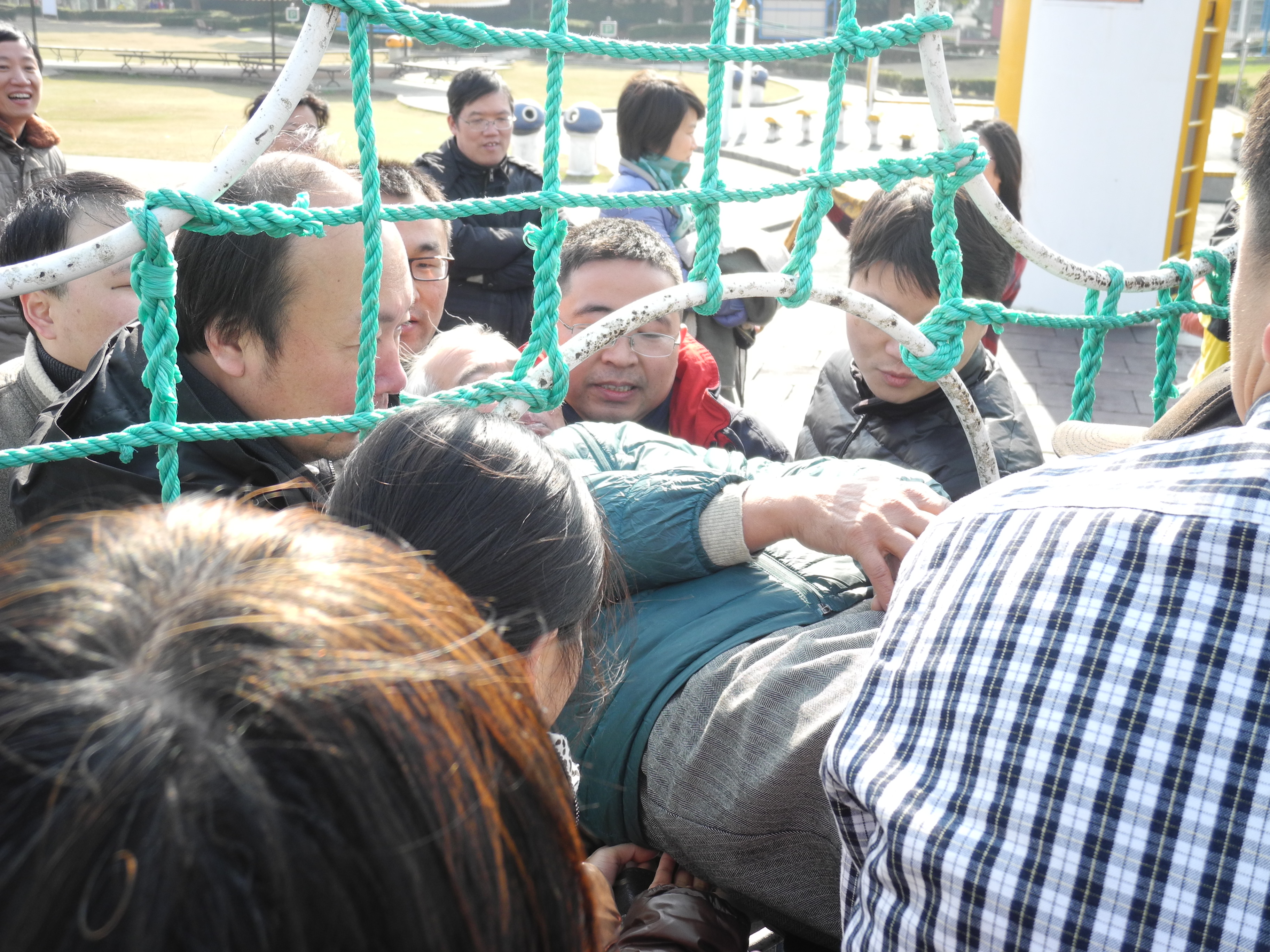 抵达拓展基地后,老师们在教练带领下进行了热身运动并在活动中随机分组,由各组分别命名为太阳队、苹果队和红星队。在规定的时间内,各组队员群策群力,快速创建并演绎了各自的队名、队歌、吉祥物以及队呼并推选出了组长。在教练的指导下,队员们开展了礼让通行、穿越电网等拓展活动。现场活动紧张而热烈,掌声、呐喊声、喝彩声此起彼伏。虽然天寒地冻,但大家热火朝天,许多人为确保安全过关还纷纷脱下厚外套,发挥了不怕苦、不怕累的精神。通过快速反应、智慧应对、互帮互助,大家齐心协力最终顺利完成了各个活动。拓展活动完成后,在教练的引导下,大家共同总结了作为一个团队要顺利完成任务、达成目标的诸多要素:团结、沟通、协作、信任、换位思考、突破思维局限、全局观念……看似简单的活动,却让人回味、发人深省。拓展活动结束后,老师们还集体参观了位于航母内的国家安全教育馆。