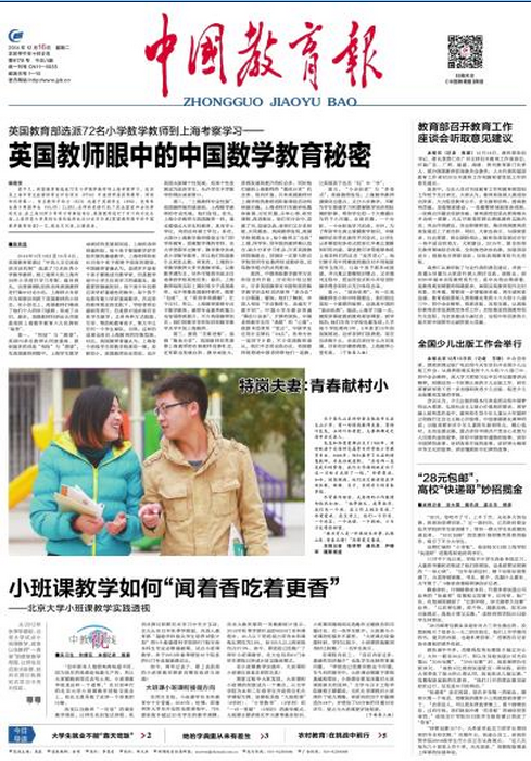 12月16日,《中国教育报》头版头条以《英国教师眼中的中国数学教育秘密》为题,发表了我校国际与比较教育研究院张民选院长撰写的文章,报道了中英数学教师交流项目的初期成果。