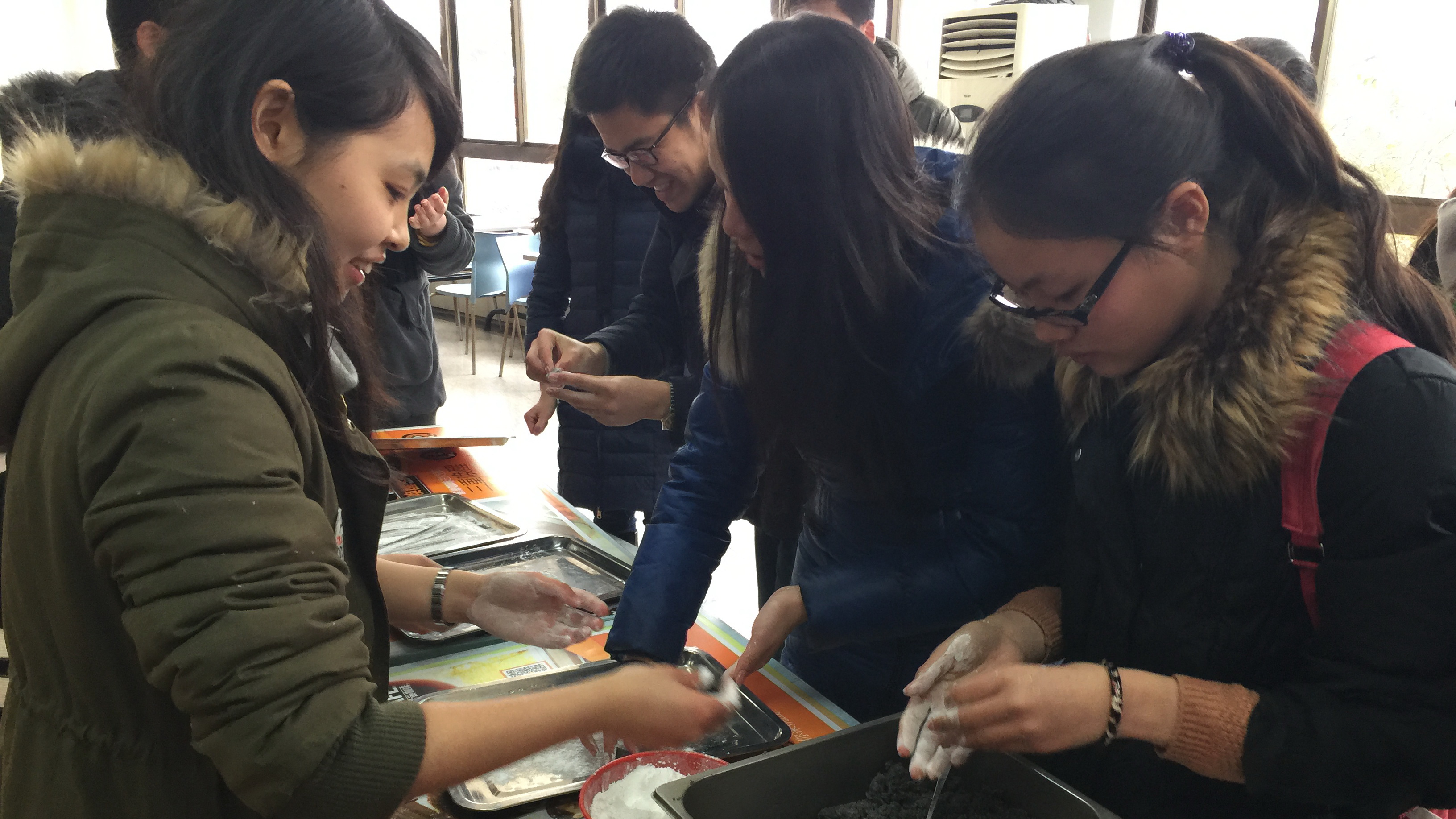 每逢佳节倍思亲,往年元宵节我们通常都与家人围坐一室闲话家常,而今年我们却相聚于第二故乡tyc41183太阳成集团,与老师、同学共享家的温暖。窗上装饰的红色春联为食堂平添了几分传统佳节的喜庆氛围,桌上早已预备好的馅心和面团更让同学们跃跃欲试,大家纷纷卷起袖管洗净双手,跟随着食堂师傅的专业指导动手制作汤圆。由于辅导员与同学大都是第一次尝试汤圆的制作,过程中难免错漏百出,时常闹出“露馅”了的笑话。汤圆的成品更是形态各异,大小不均,可纵使手艺不精,双手、衣服和脸上都粘满面粉,大家仍旧乐在其中。