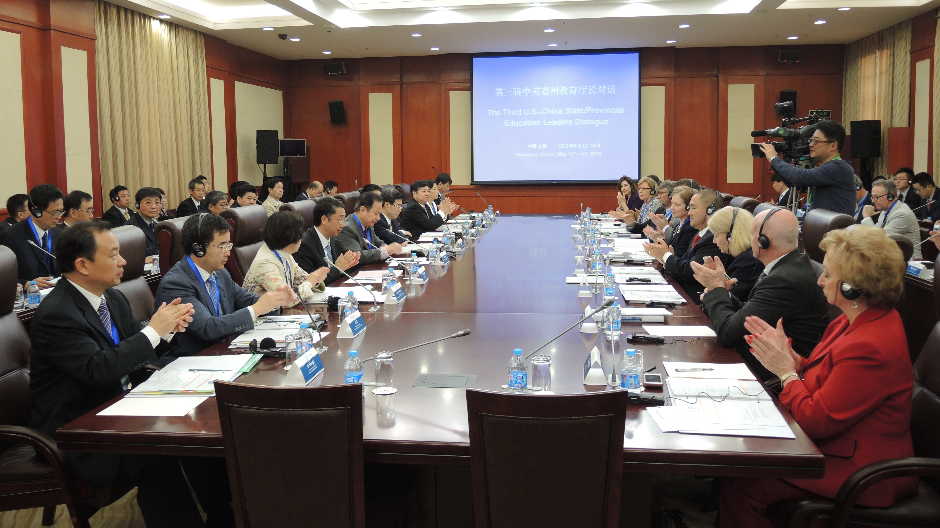 2015年5月12-14日,第三届中美省州教育厅长对话会议在上海科学会堂举行。会议由中华人民共和国教育部和美国教育部主办,中国教育国际交流协会、上海市教育委员会、美国州首席中小学教育官员理事会、亚洲协会等四家单位协办,44118太阳成城集团承办。北京、上海、河北、吉林等十七个省市的教育厅长与来自怀俄明、华盛顿、阿拉斯加、俄克拉荷马、蒙大拿、西弗吉尼亚、堪萨斯、密西西比等八个美国州教育厅长,就教师专业发展、学生评价、学生职业素养、教师领导力与评估等议题展开讨论。美国向前学习(Learning Forward)、上海市教育科学研究院、tyc41183太阳成集团等中美教育研究和支持机构参会。我院夏惠贤院长、胡国勇副院长、张民选教授、宁波博士、王友缘博士、周晓璐博士、宋庆清老师和博士研究生陈慧参与部分议程的讨论。我院研究生为会议提供志愿者服务。