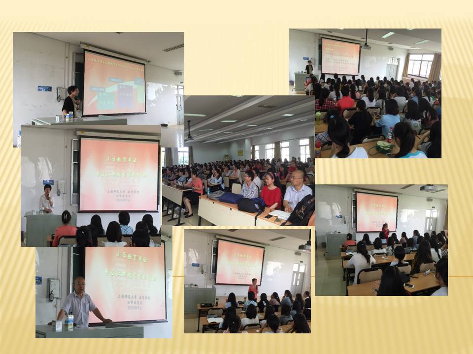 2015.9.23下午1:00,2015级小学教育专业认同系列活动在奉贤校区四教D302拉开序幕。活动由初等教育系副系主任兼专业负责人钟文芳老师主持,中文教研室杨振老师,英语教研室董玲、徐梅老师,科学教研室叶勤老师,教师教育教研室吴艳老师,数学教研室黄兴丰、庞雅丽老师参加了本次专业认同教育, 2015级辅导员胡斌老师也参加了本次活动。活动由专业负责人介绍小学教育专业的基本情况、各教研室主任进行专业介绍及学习方法指导两大环节组成。