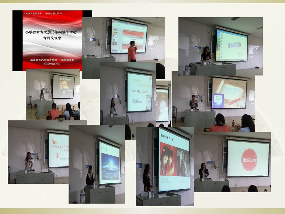 “立足卓越教师培养,争创经过文明岗”,2015.9.23下午1:30,初等教育系巾帼文明岗创建系列活动——读书活动专题交流会在奉贤校区四教D302顺利开展。本次交流会由宋忱慊、赵阳等10位2013或2014级小教专业学生和2015级小教专业的全体学生分享她们的读书体会。此外,初等教育系钟文芳、叶勤、杨振、董玲、徐梅、吴艳、黄兴丰、庞雅丽八位老师以及2015级辅导员胡斌老师也参加了此次读书交流会。活动由叶勤老师主持。