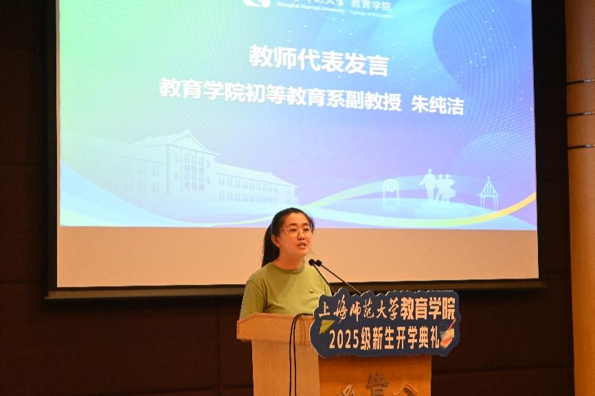 朱纯洁作为教师代表发言,以温情而坚定的话语寄语新生,鼓励大家在“读万卷书”中夯实专业根基,在“行万里路”中体悟教育真谛,涵养师者仁心,锤炼育人本领,争做知行合一的教育追梦人。