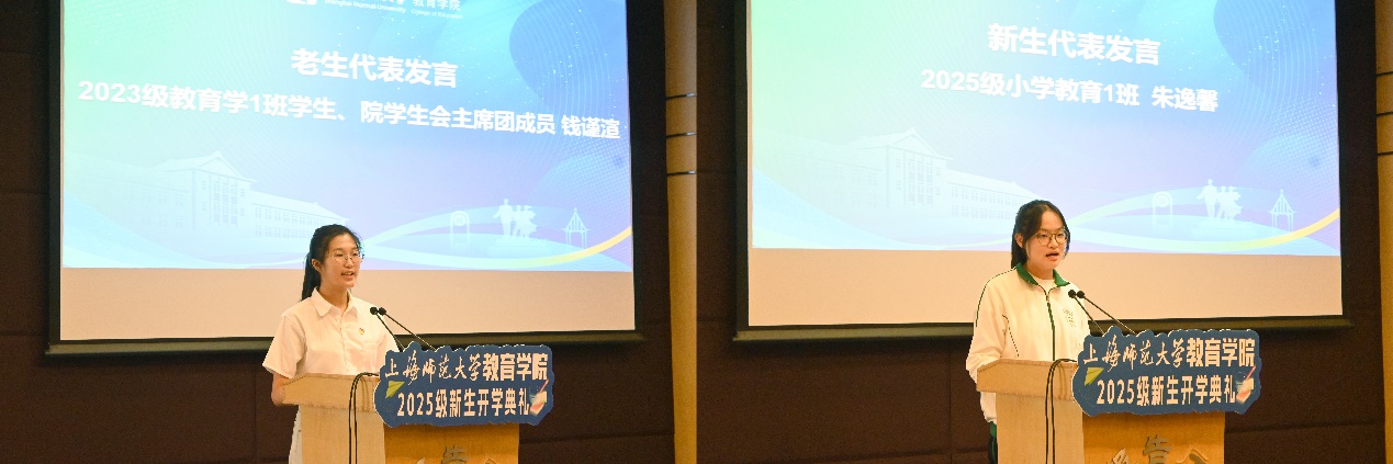 2025级小学教育1班朱逸馨作为新生代表发言。她表达了对教育事业的炽热情怀,呼吁同学们践行“心有大我、至诚报国”的教育家精神,为教育强国贡献光热。